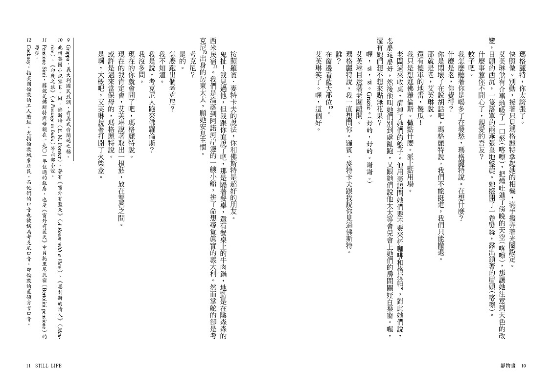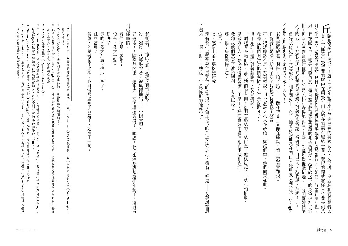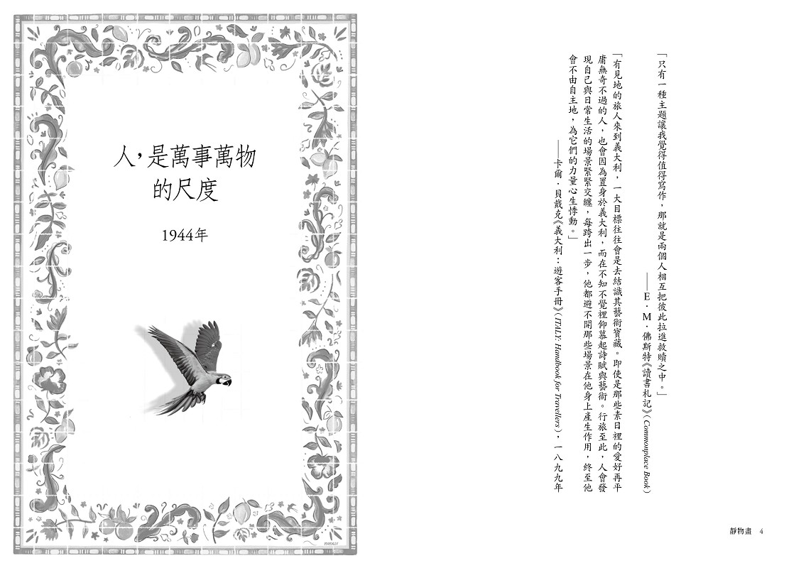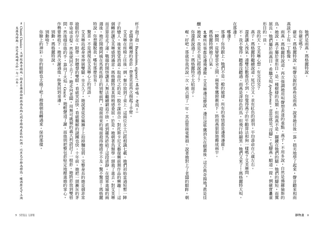 艾芙琳在座椅上往後一倒,餐巾放到了桌上。這兩位女士已經相識七載。她們初始當過短暫一陣子的戀人,後來慾望消退,取而代之的是一股不謀而合、對托斯卡尼文藝復興前期作品的興趣──這個轉折讓艾芙琳感到滿意,瑪格麗特某某則稍感委屈。於是,她朝著鳥類學一頭栽了進去。對艾芙琳而言算是走了運,戰端的開啟讓某人無法繼續窮追不捨,直到羅馬終結了這段清靜。在盟軍進城的兩週後,她打開她阿姨在馬真托路上的別墅前門,迎面而來的場面殺得她措手不及。驚不驚喜!瑪格麗特說。你想擺脫我,哪有那麼容易!