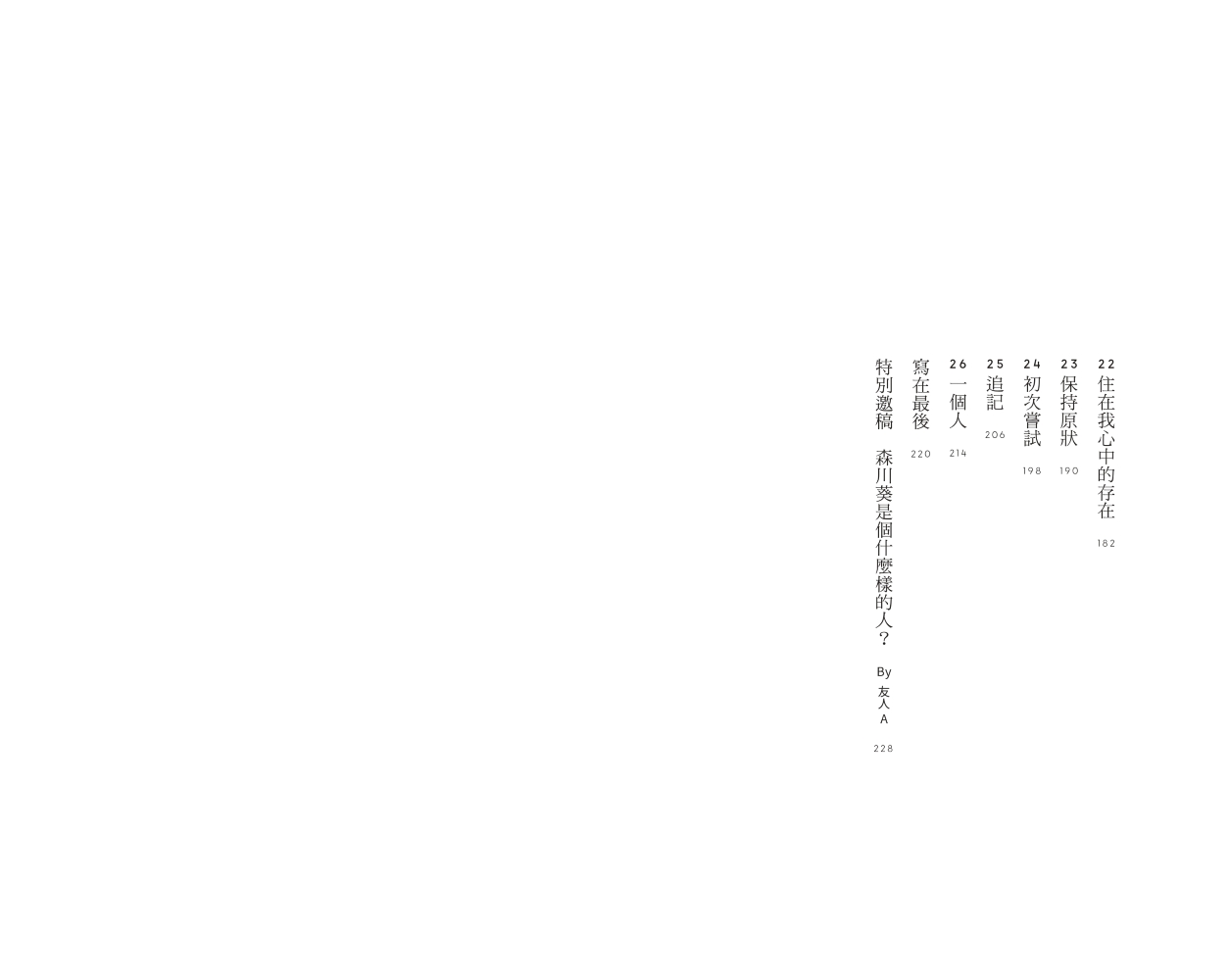 轉眼間幾年過去,最近稍微離開了當初自然而然開始的演員工作,參加了一個綜藝節目,叫做《真假驗證中》,還獲得了「Wild Speed 森川(狂速森川)」這個新綽號。原本以為我很不擅長要我用自己的話來表達想法,不過現在正慢慢體會其中的樂趣。但我並不是對演戲感到厭倦。就像咖哩飯放隔夜會更好吃,或是背不起來的東西,睡一覺起來後就記住一樣,我只是稍微沉澱一下。