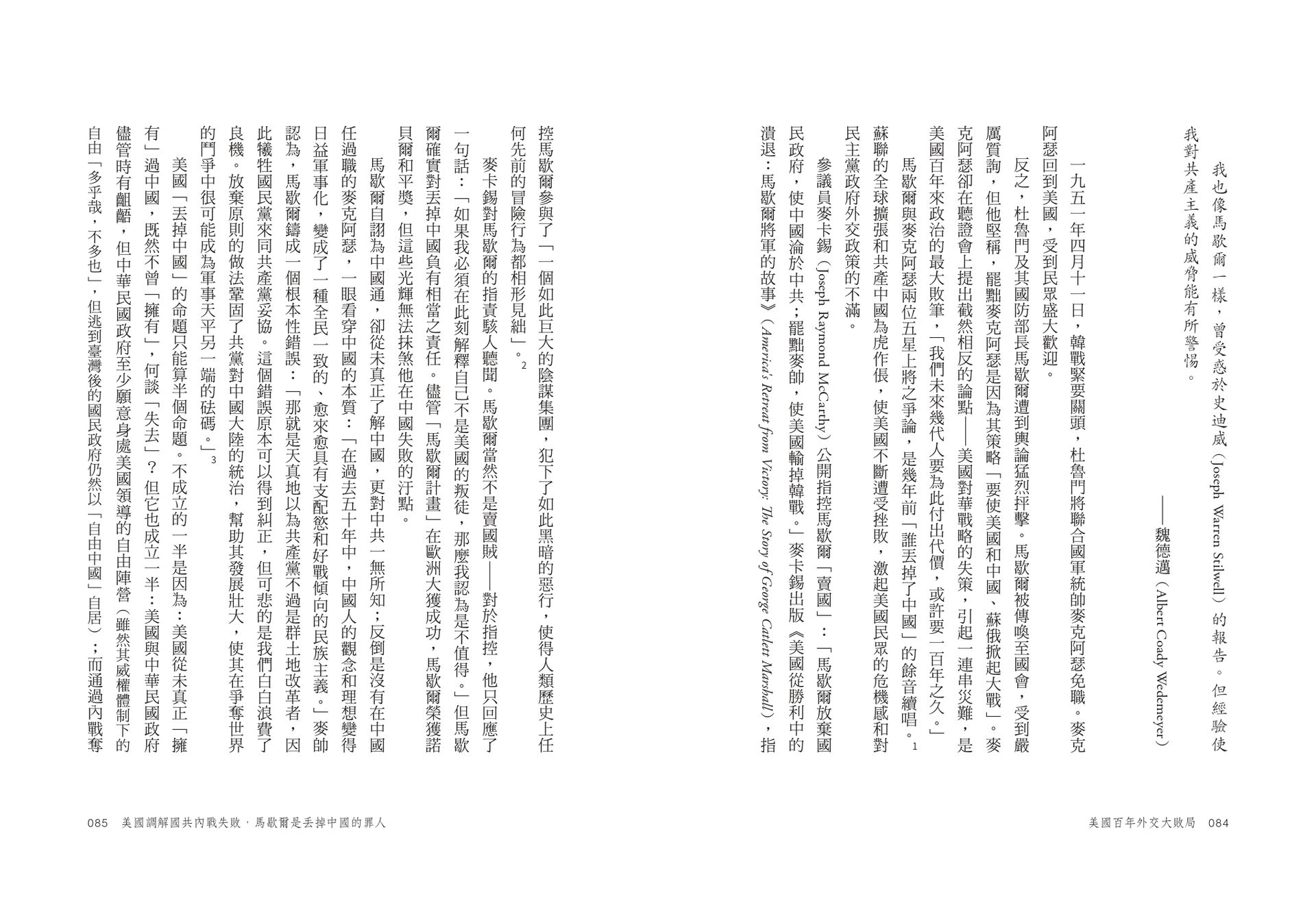 麥卡錫對馬歇爾的指責駭人聽聞。馬歇爾當然不是賣國賊——對於指控,他只回應了一句話:「如果我必須在此刻解釋自己不是美國的叛徒,那麼我認為是不值得。」但馬歇爾確實對丟掉中國負有相當之責任。儘管「馬歇爾計畫」在歐洲大獲成功,馬歇爾榮獲諾貝爾和平獎,但這些光輝無法抹煞他在中國失敗的汙點。