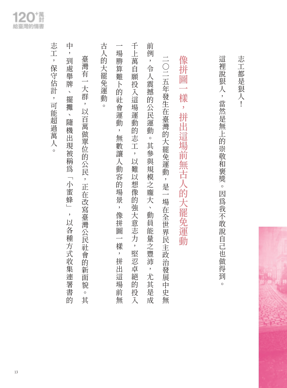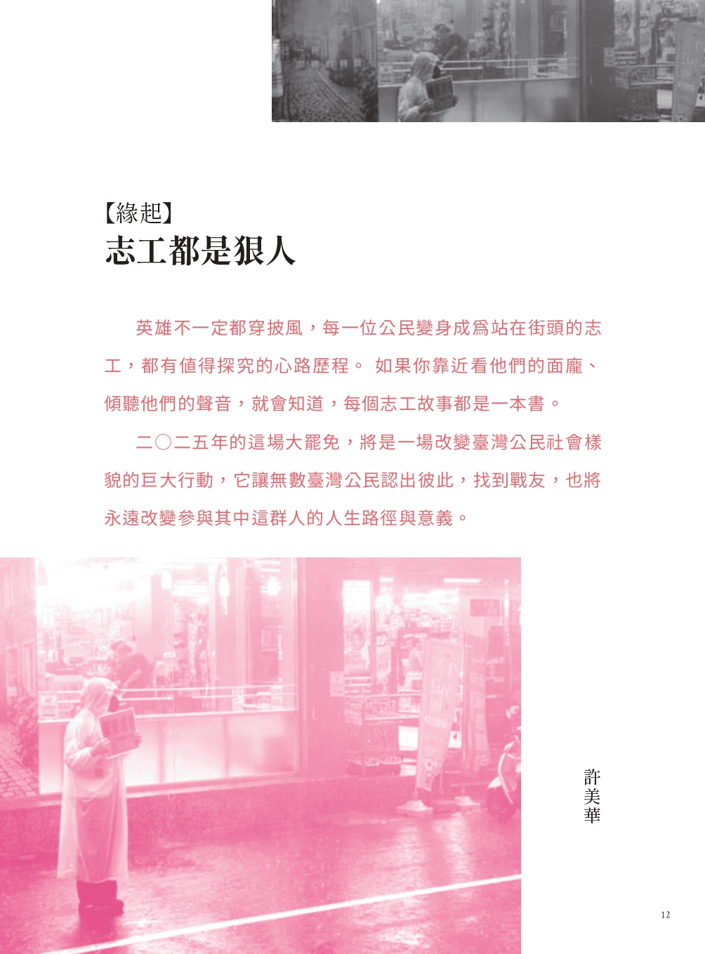 他們多數是從未站過街頭的政治素人、忙著送稚嫩幼兒上下學的年輕媽媽、經濟優渥內向退縮的女性、過去對政治冷感的人生勝利組、深藍家庭出生的政治小白兔、抱著正待治療的癌症身體、有自己小事業的中產階級、十一歲的小志工、退休的老師、等待一條安全回鄉路的海外臺灣人、深怕落人後地二話不說掏錢課金主……每一群人,各自不同,卻願意為了同一件事站出來。