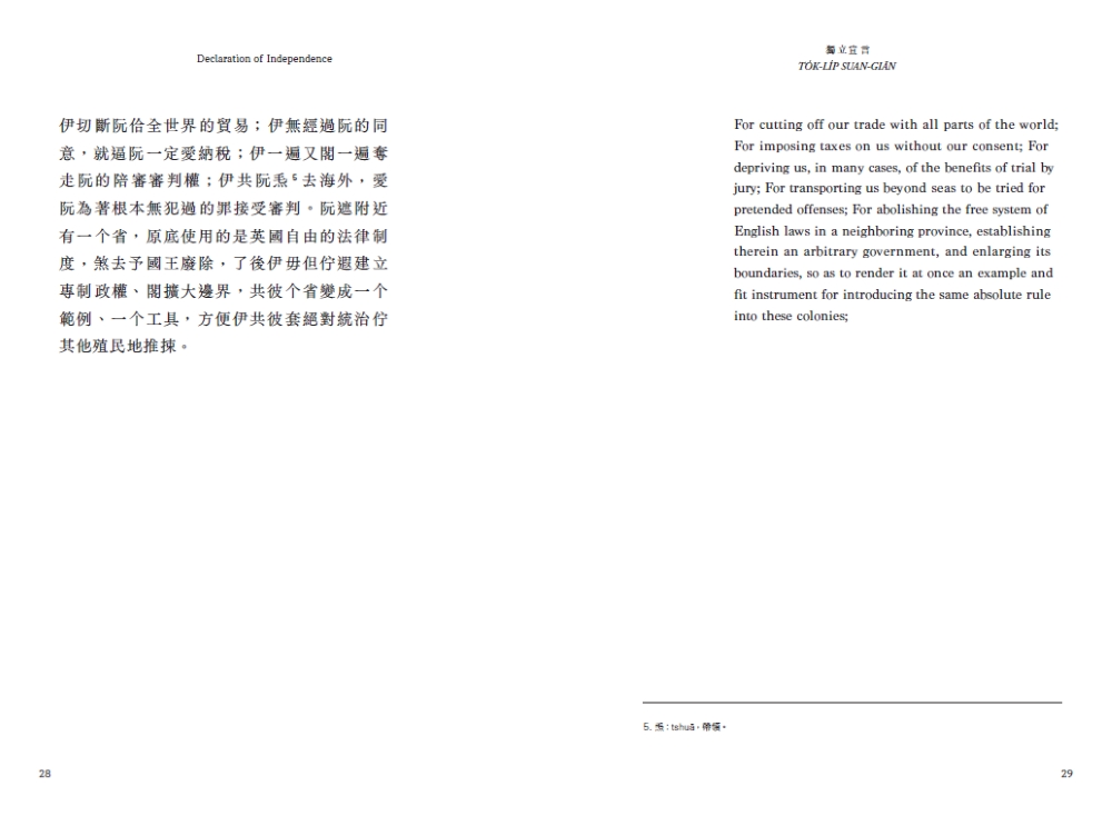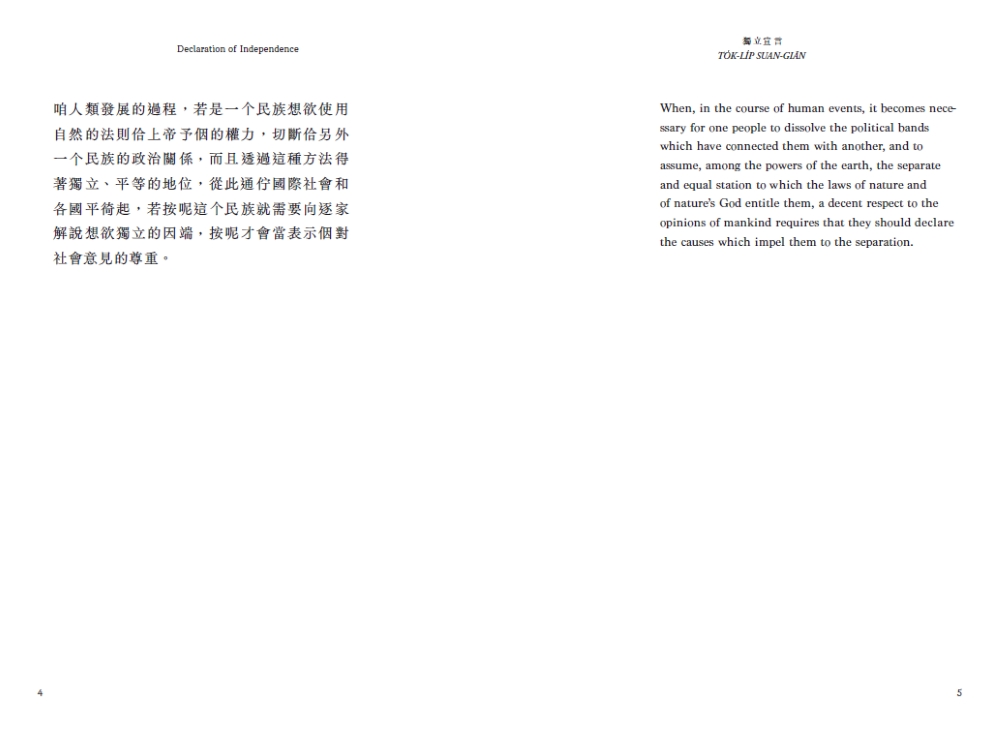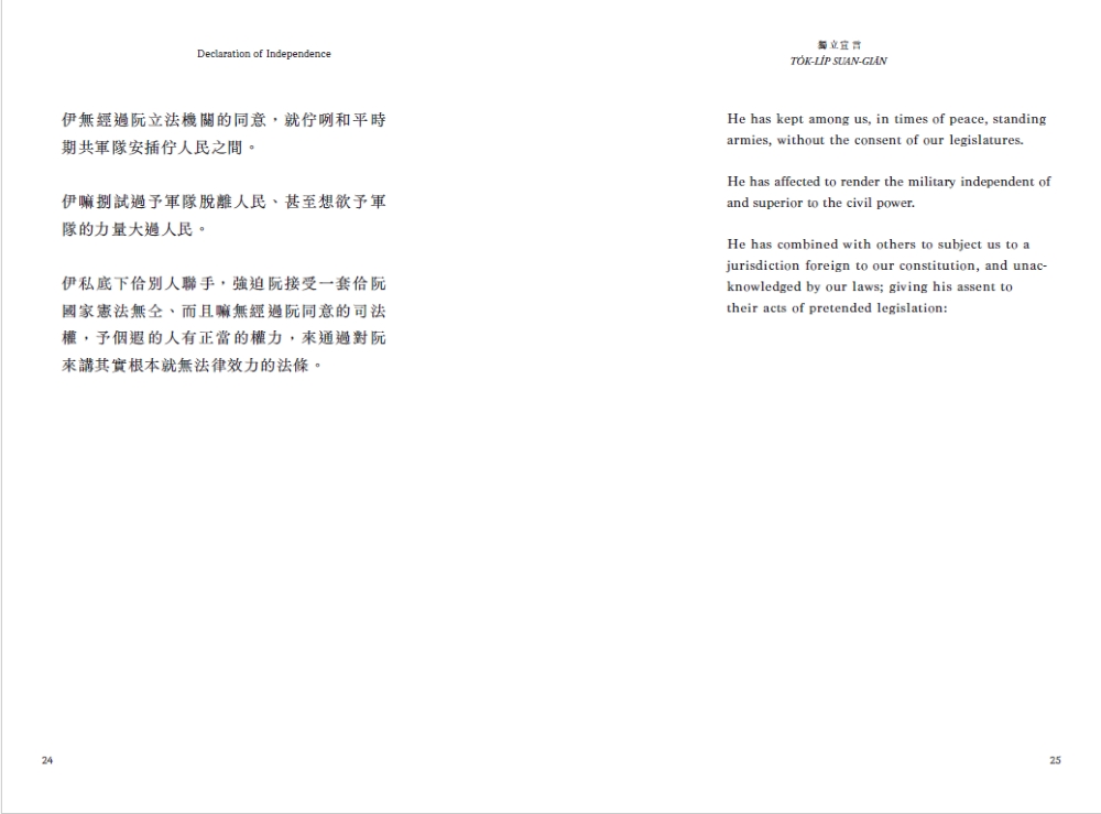 ● 以台文譯介人類史上重要思想著作:首次以台文翻譯《獨立宣言》,讓這份對全球民主影響深遠的文獻,能以台灣本土語言進行閱讀、學習與討論。