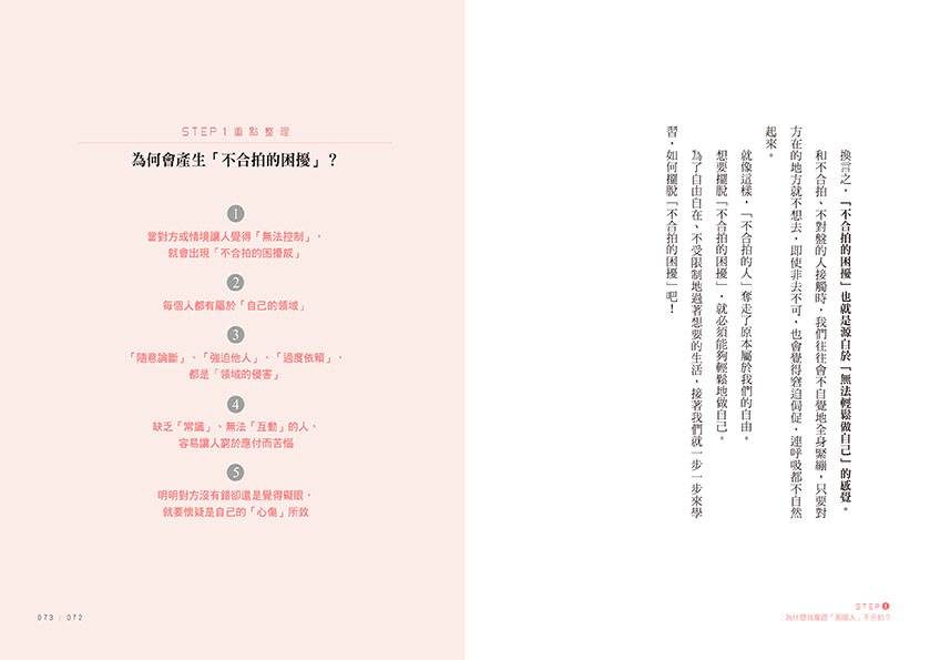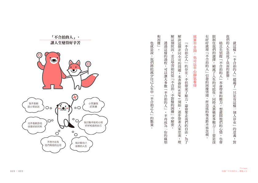 作者強調,因故做出過分行為的不合拍對象,以及無法和對方好好相處的自己,兩方的處境都一樣需要被溫柔地包容和接納,基於人性理解所提出的論述深具療癒力,也讓彼此更沒有負擔。