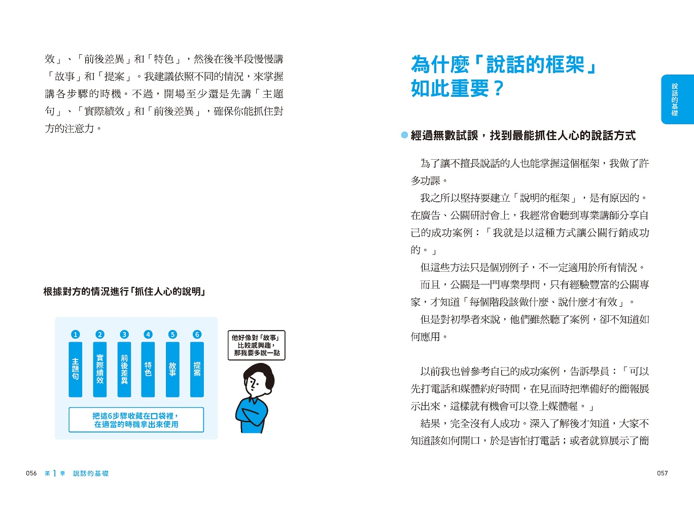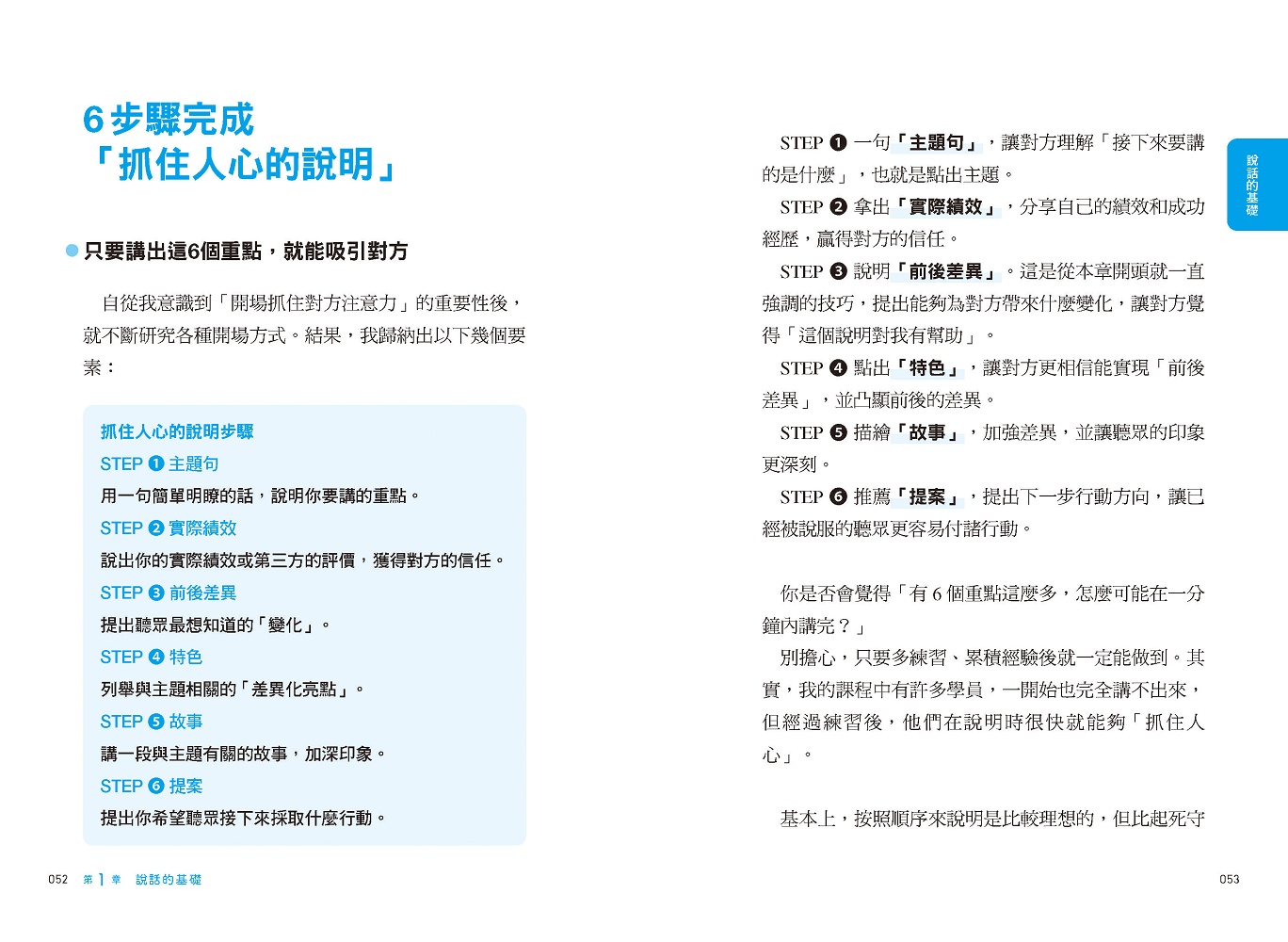 書中以真實案例、公式化步驟拆解「第1分鐘說明技巧」,帶你學會在最短時間內吸引聽眾、建立信任、贏得對話主導權。從銷售到開會、從簡報到面試,不論你是否善於表達,只要掌握這套「6步驟說話公式」,你會發現:不管開口談什麼,大家都聽得津津有味!