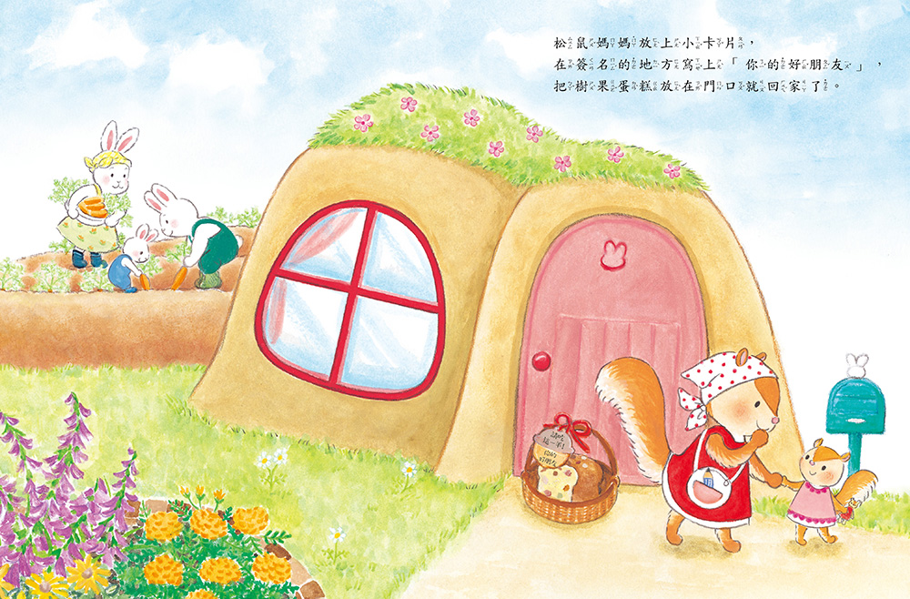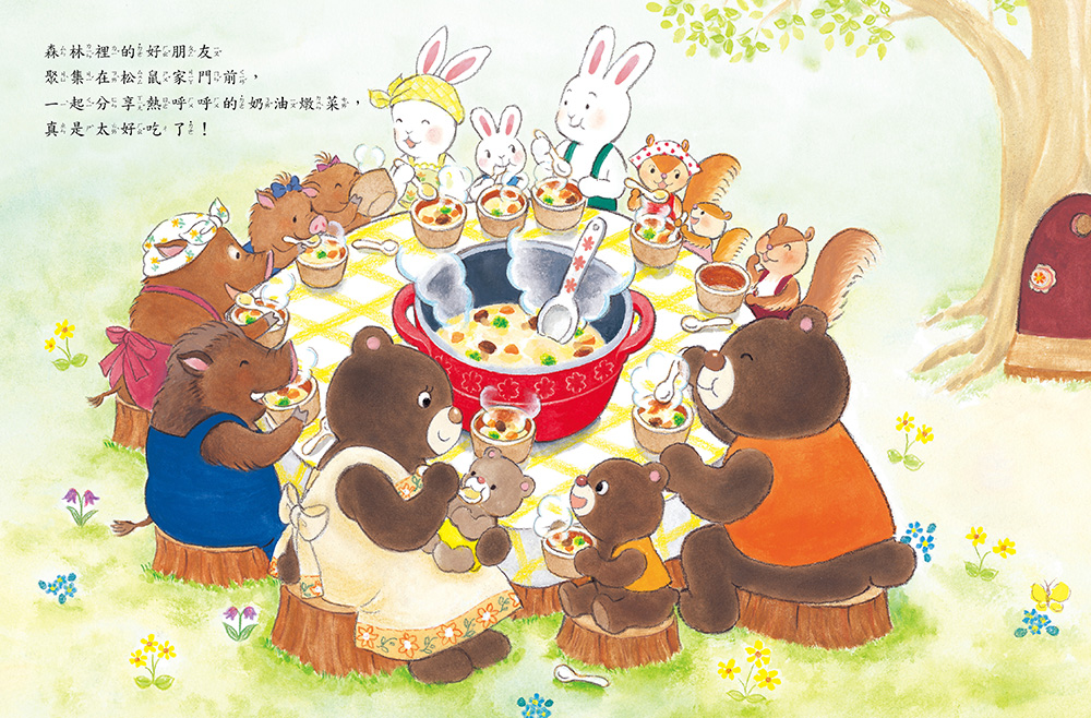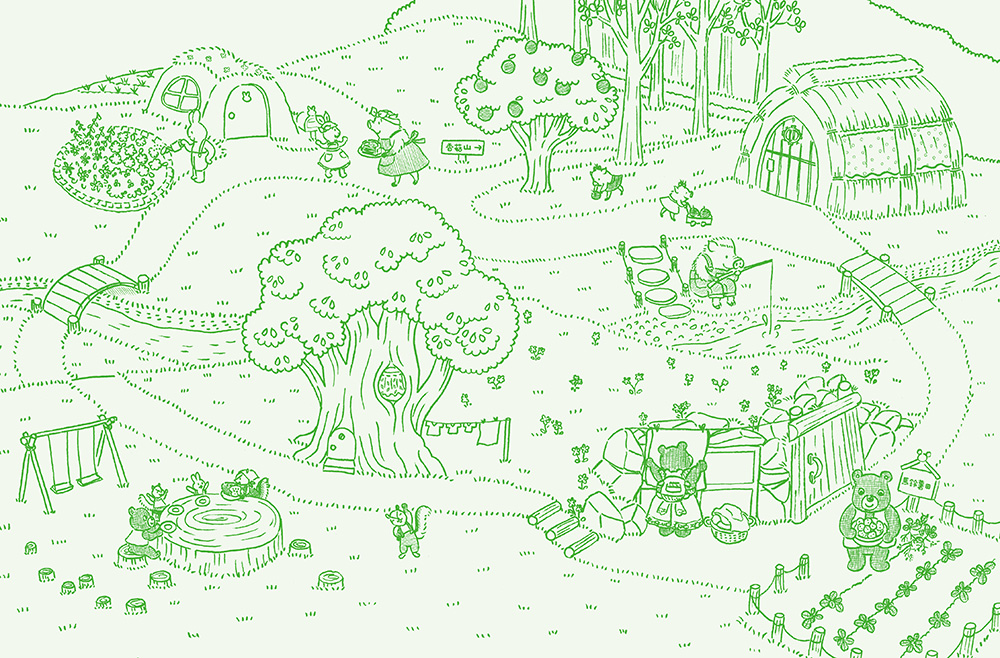 森林裡的場景就是你我身邊最熟悉的日常,回想小時候,媽媽和鄰居媽媽們也都是這樣一家一家去串門子、話家常。你也有忍不住想要分享美食的朋友嗎?