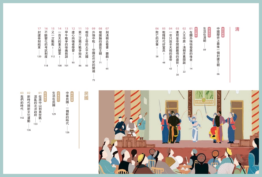 從有趣又吸引人的角度切入,輕鬆閱讀也能獲得滿滿「知識量」:〈一年只放半天假的模範皇帝〉、〈富有的乾隆皇帝〉、〈到清朝去看書、聽戲吧!〉、〈外強中乾——中國近代史的開端〉、〈不斷變化的考試制度〉……。