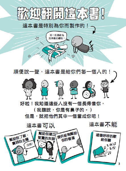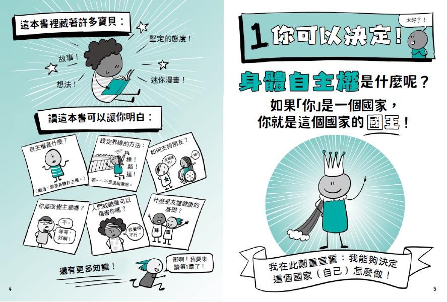 本書以趣味漫畫和簡單易懂的譬喻,深入淺出解釋身體自主權及積極同意相關知識。並從日常生活和身體自主相關的小事出發,讓孩子時時覺察、尊重自己的感受,練習表達自己並視情況求助。