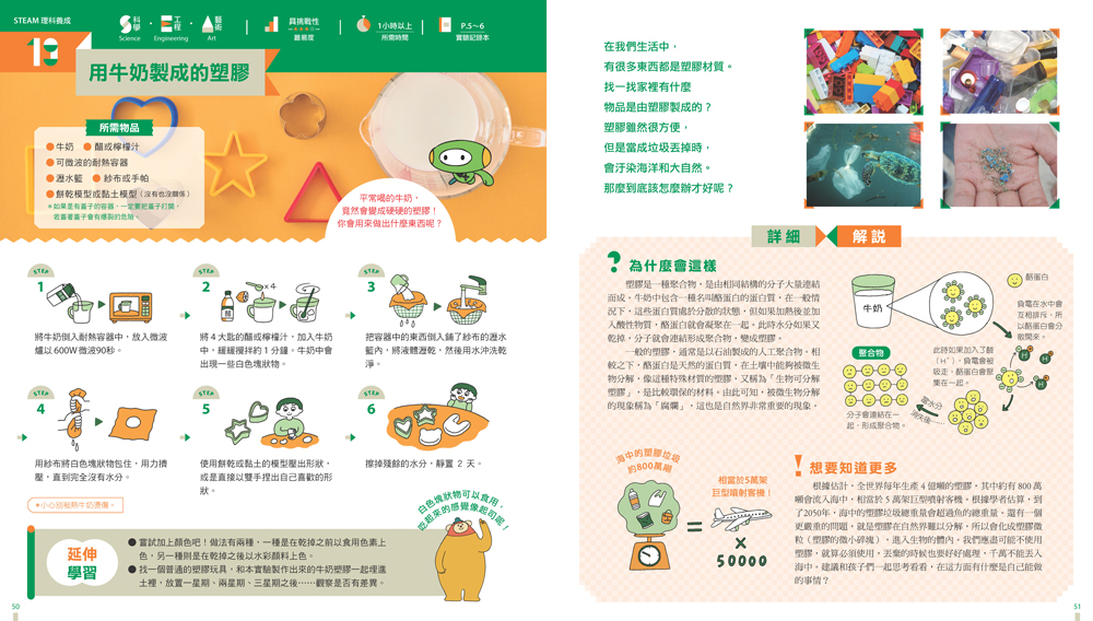再來和大家分享另外一個有趣的實驗,書中的第19個活動結合「S科學」、「E工程」和「A藝術」三個領域,利用牛奶和醋的化學反應做出「生物可分解塑膠」。這時候,孩子就可以畫下自己設計的作品,也可以把牛奶塑膠和一般塑膠埋進土裡,每週觀察變化,並把這些過程寫進「實驗記錄本」的表格裡,一篇又一篇的自然觀察筆記就成形了,甚至可以延伸做為日後參加科展的素材呢!