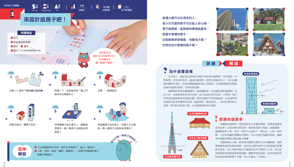 以貼近孩子生活經驗的實驗活動為主題,結合插圖、照片與互動式操作,讓孩子可以藉由玩樂,廣泛探索STEAM的不同面向,如材料與材質特性、自然現象的成因、建築設計的應用等,並從中收穫知識與滿滿的成就感。