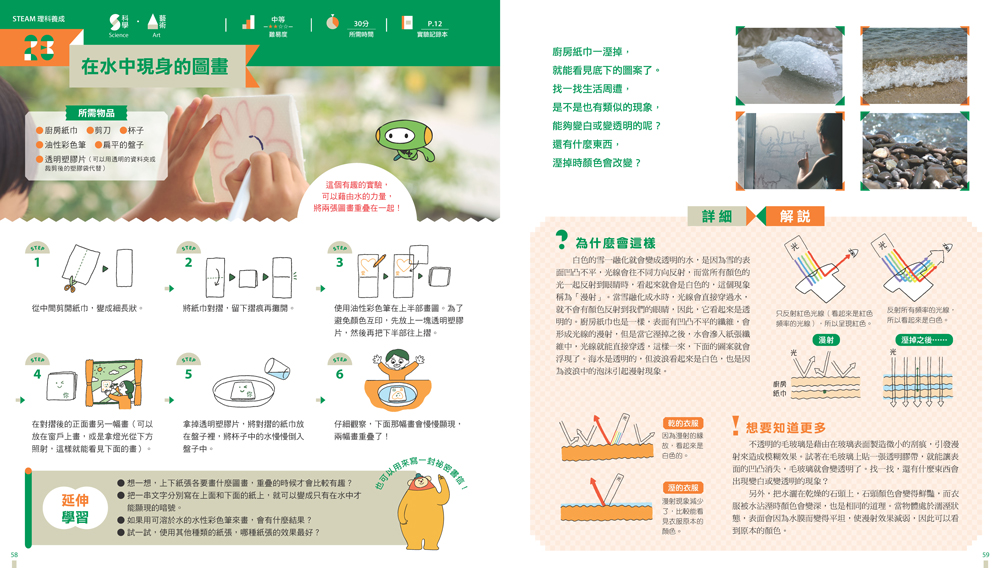 每個活動皆附有給親師的「詳細解說」,可作為探討實驗的話題,並搭配實際照片連結日常。在陪伴孩子閱讀、動手做的同時,除了能適時說明相關的知識或常識,輕鬆理解活動背景和實驗原理,也能以此作為學習的延伸,激發孩子運用創新思維解決問題。