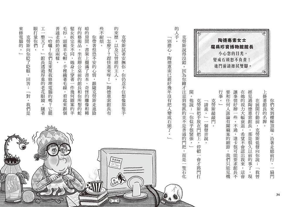 「不,博物館最近有嚴重的財務危機,陶德惠索館長原本還寄望這場特展可以帶來大筆收入呢!在蛇髮女妖館長的眼睛還能把生物變成石頭的時代,她是收藏了大量雕像,但她現在的視力大不如前,博物館已經失去吸引力了。」