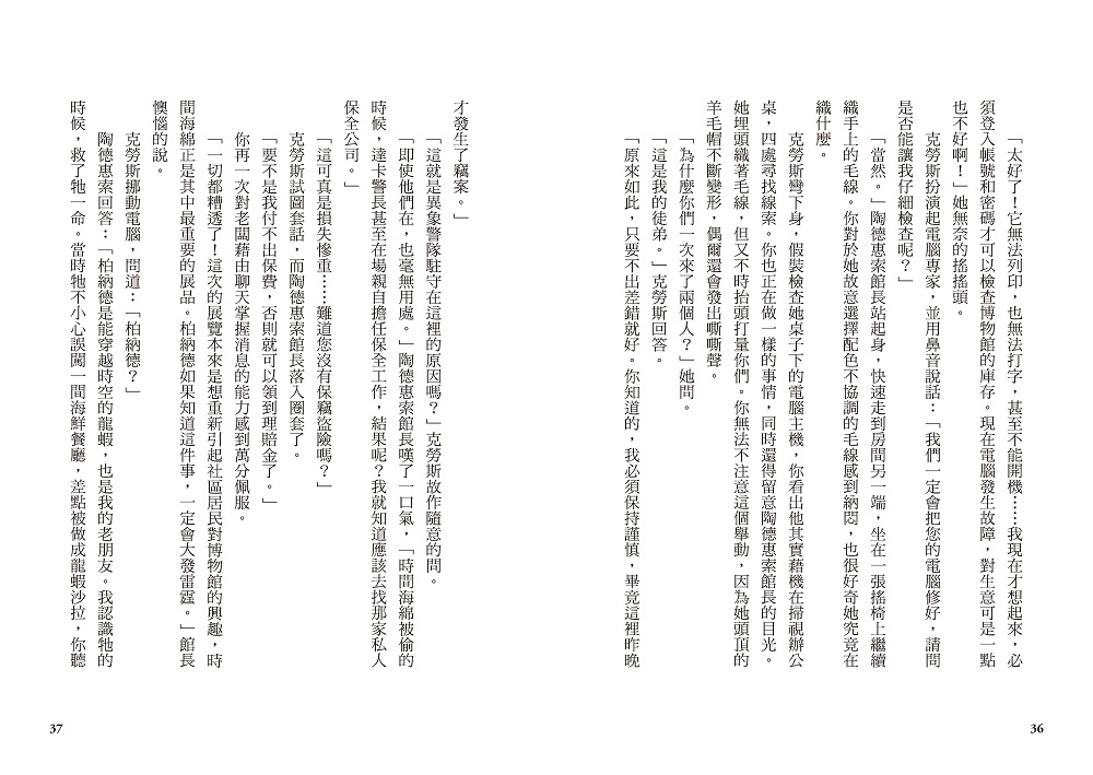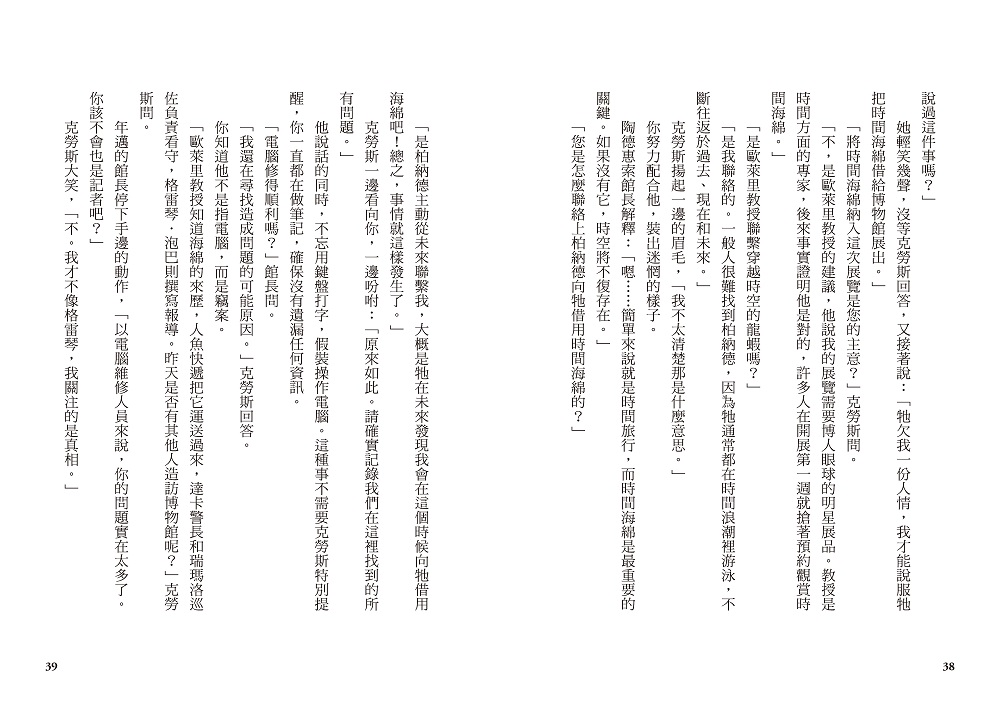 格雷琴說:「放心,我不可能是嫌疑犯。記者會結束後,我親眼目睹警長『達卡』鎖上了時間海綿的展覽室之後,就回辦公室趕稿,那是晚上十點的事。達卡說他在午夜十二點去展覽室巡邏時,發現海綿不見了。」
