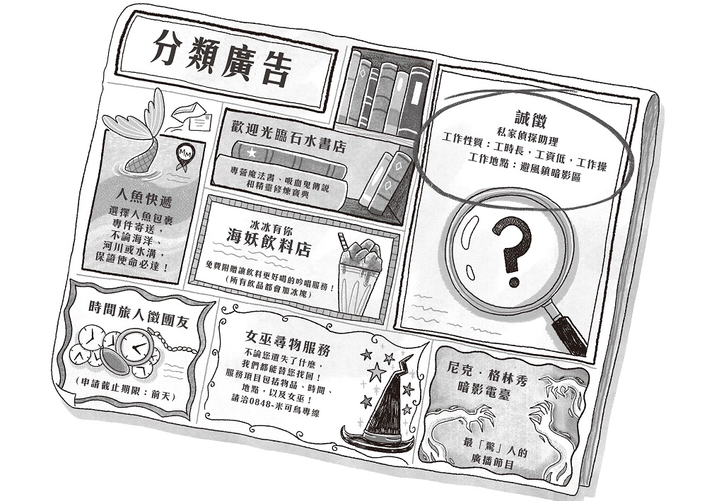 你瞄了一眼手錶,納悶著到底要等多久,老闆才會出現?自從擔任偵探助手以來,你早已習慣造訪各種奇怪的地方。避風鎮大部分地區都很正常,唯獨暗影區住滿了吸血鬼、狼人、哥布林……其中也包括你的雪怪老闆克勞斯.索斯塔。和他共事通常很有趣,除了在寒冷刺骨的清晨被關在辦公室外面。
