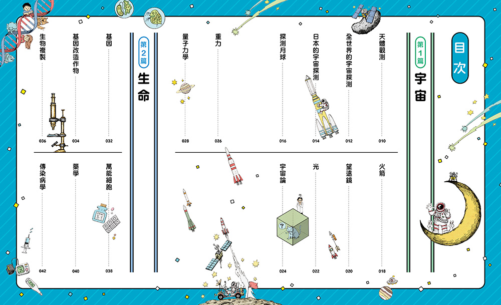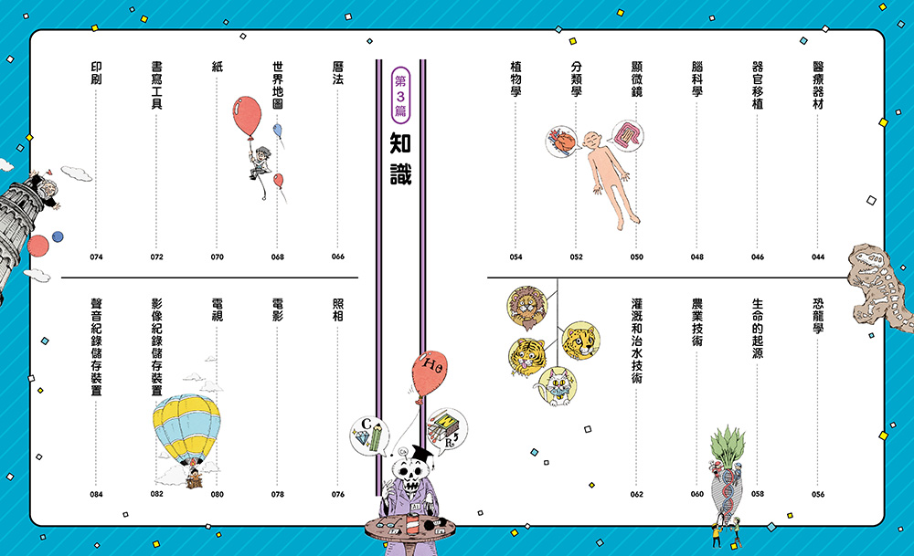 ★上冊分為「宇宙、生命、知識」三個篇章,每篇之下再細分若干主題,介紹改變人類生活的50項發明與發現。