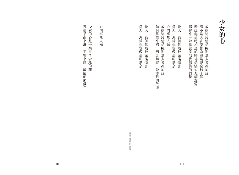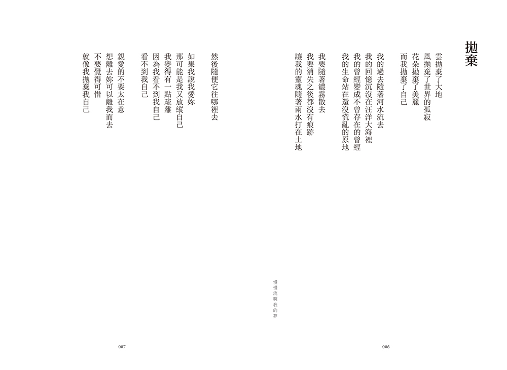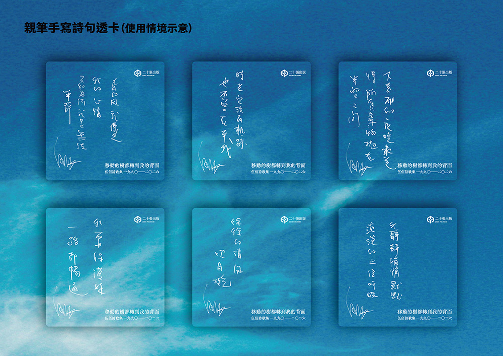 「飛翔時傷悲是一種奢侈的行為/我怎麼突然有一種莫名的喜悅當我穿梭在黑暗裡面」,伍佰的詩中盡是衝突的自由,是一名離家北上的音樂詩人對昨日與明日的反覆質問,他的文字擁有絕對的旋律,字句能隨時出入,一首詩創造了多種歧義的靈魂。聽伍佰的音樂理所當然,我們心中各有夢幻歌單,然而,一旦視角全面由「文」與「字」切入,得以發現他書寫的是:溝通彼此的介質。舞台上他將自身狂狠地拋往聽者,詩集裡的他則緩緩傾訴,是一名寧可背對讀者而讓出解釋權的詩人。詩也是活的,放心閱讀、理解吧──他將成為每個人的身影。從〈少女的心〉到〈樹風〉的愛戀離捨、從〈斷腸詩〉到〈深秋的祝福〉的死生意象……伍佰另闢蹊徑,編整篇目,尋獲新的觀看角度,種種懸念又生葉發枝,令水倒流。他的語言亦即透明的容器,放置眾多意識,卻顯得收斂而節制。當初以創作對抗人生的青年,如今仍在,我們也依舊浸潤在「穿越時空之中漫天繁星晶瑩的眼淚」裡,年歲變了,時間移動不止,伍佰持續在刺探生命的可能性,而那將成為暗示,紛紛落在我們肩上,一起慢慢地流。