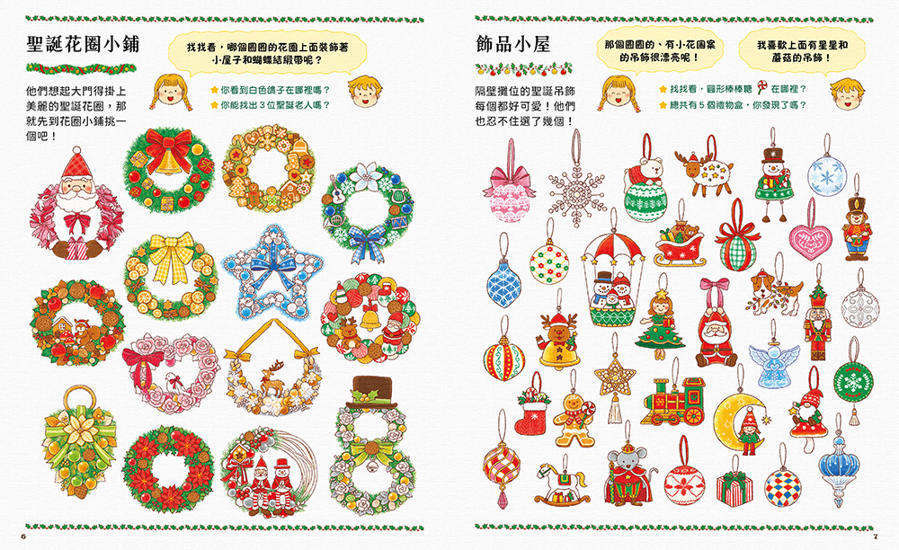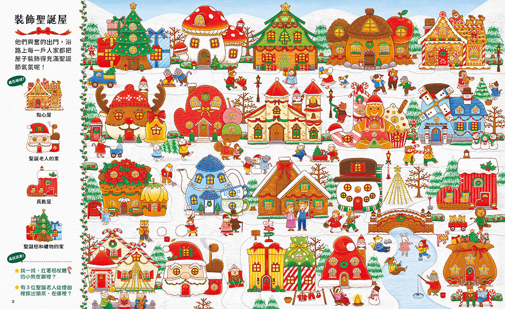 他們到了飾品小屋、蠟燭店、玩具店和蛋糕店等店鋪,被一個又一個可愛、獨特的商品吸引,好難決定要買哪一個啊!而要在這些目不暇給的東西中找到想要的那一個,更是不簡單!希望小朋友能發揮觀察力和專注力,幫幫他們的忙!遊戲過程中,家長如果發現孩子無法馬上找到圖像,請適度給予引導,例如對孩子說:「先找一找哪間屋子有煙囪,就能找到從煙囪中探出頭的聖誕老人在哪裡喔!」如果孩子找到了,請鼓勵他:「太棒了!找到一位了,還有兩位在哪裡呢?」又例如,要找枴杖糖造型,也可以提示孩子「它不一定是糖果的樣子,可能很大也可能很小唷!」
