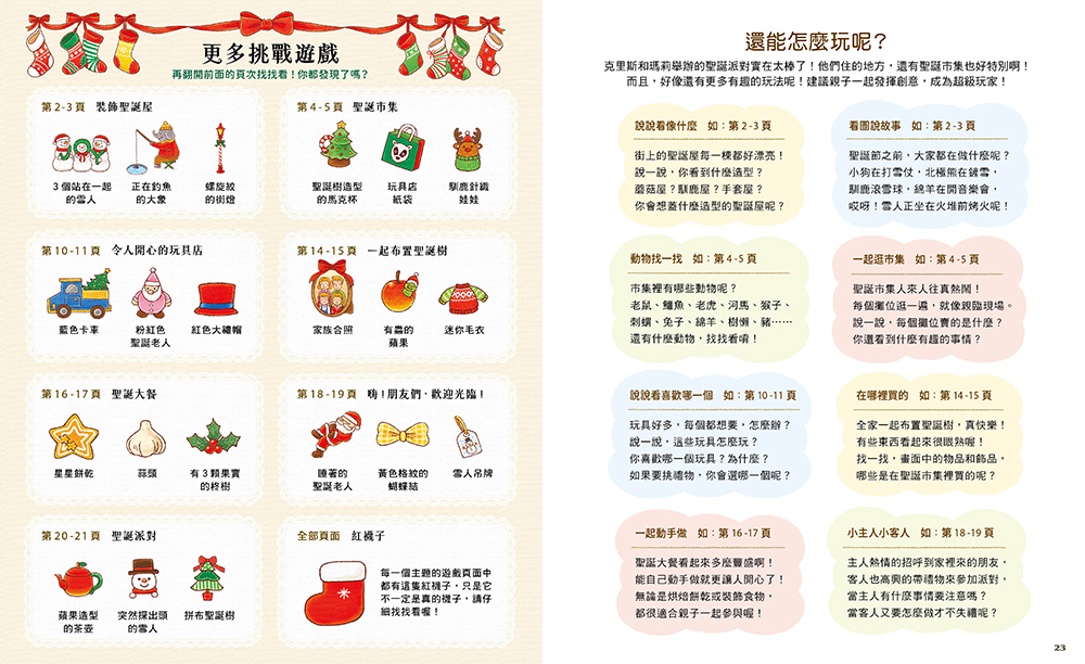 最後,書末也增加了「更多挑戰遊戲」,每個主題添加三樣要尋找的物品,並精心設計「紅襪子」彩蛋,考驗讀者的眼力!還有還有,作者的細緻繪圖處處隱藏著巧思,可別錯過「還能怎麼玩?」自創遊戲題目的建議,從看圖說故事到一起動手做等,期待親子共讀時充分運用這本聖誕大寶藏,發揮想像力與創意,成為超級大玩家!