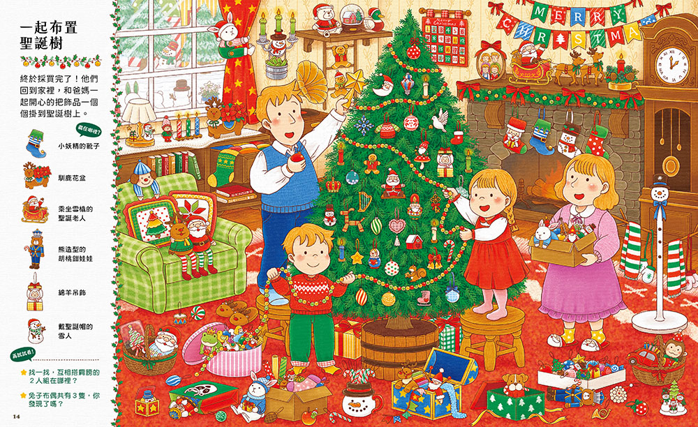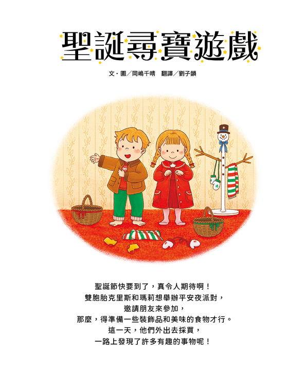 《聖誕尋寶遊戲》是一本融合聖誕節慶與尋寶遊戲的趣味繪本,雙胞胎兄妹為了買齊派對所需的東西,前往聖誕市集裡的各個店鋪採購,經由他們的足跡,可以看到各種繽紛多彩、令人眼花撩亂的聖誕物品和布置,一步步感受聖誕節的氛圍,對聖誕節的來臨也愈加興奮與期待。
