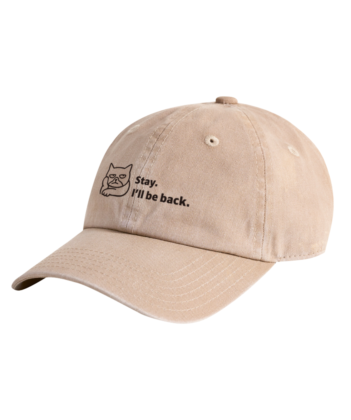 簡約卡其色設計,好看的老帽版型,搭配低調刺繡,寫著「Stay, I will be back.」跟一隻無奈貓貓。這是你對家裡那隻(或心裡那隻)貓的承諾:「乖乖待著,我出門一下,很快就回來。」