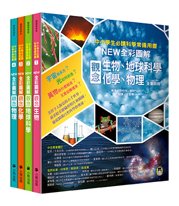 《中小學生必讀科學常備用書:NEW全彩圖解觀念生物、地球科學、化學、物理(全套四冊)》是一套符合現行課綱,專為國中自然科教材所設計的科學百科。適合中小學生先修,更適合作為課本的延伸教材,無論是課前預習、課後複習,都能在自然科學的學習上事半功倍,更有信心面對升學會考。